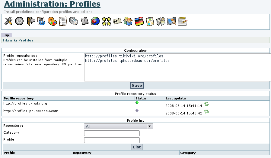 The administration interface in Tiki for profiles allow to select the profile repositories to use and to install profiles from a list.